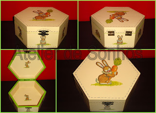 Mais uma caixinha hexagonal, esta de tamanho méd. grande. Em madeira pintada à mão com aplicação de decoupage. Será que foi enchida de amêndoas e ovinhos de chocolate nesta Páscoa? :)